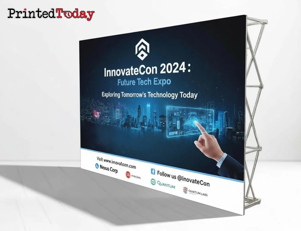 Rigid presentation: UV-printed media maintains perfectly flat display across 4-metre spans without waviness or sagging concerns, creating geometric precision appropriate to premium booth positioning.