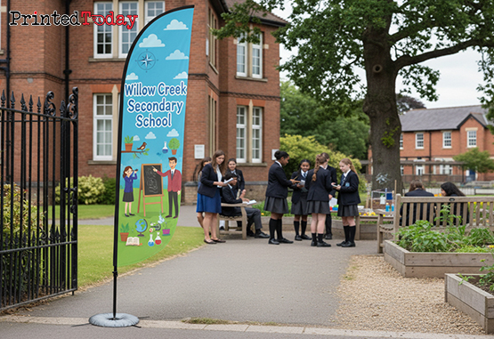 Printed Today produces 4m custom crest flags using high-grade poly-fabric and advanced eco-solvent printing for vivid, long-lasting visuals. Each flag kit includes a pole system and round water base for quick setup and reliable stability.