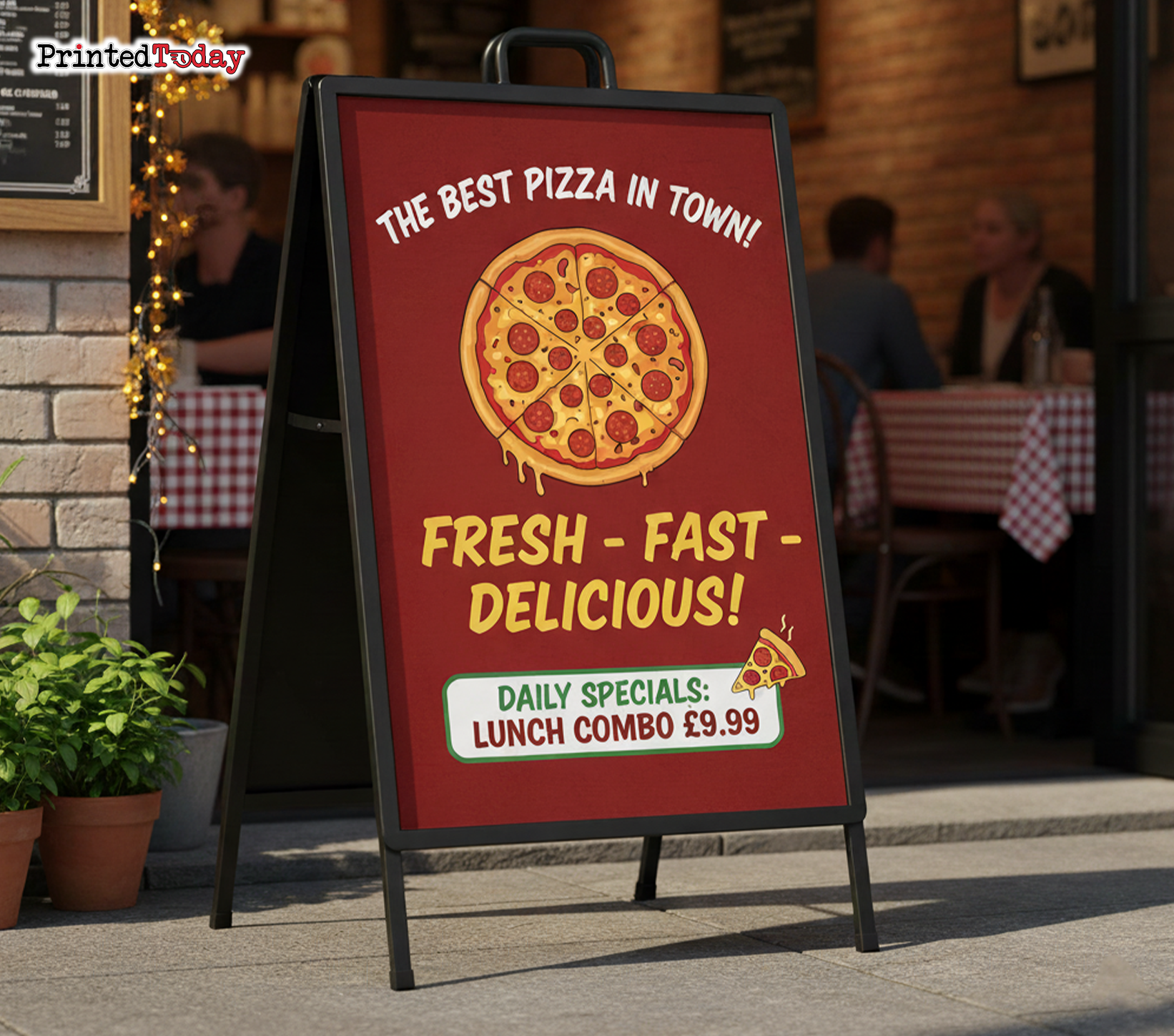 Upgrade your business signage with the A1 Pavement A Frame Sign Board from Printed Today. This A board pavement sign is designed to create a strong visual impact, ensuring that your promotions and messages get noticed.