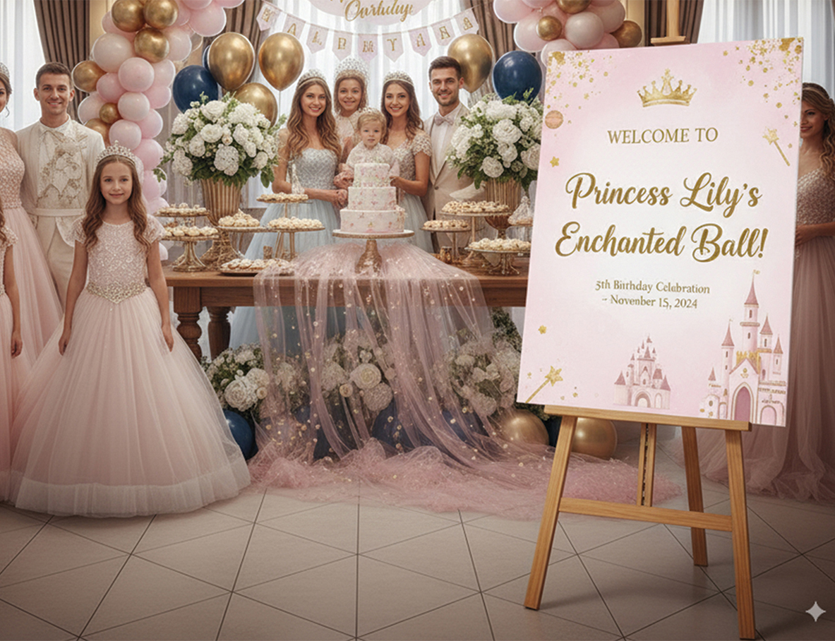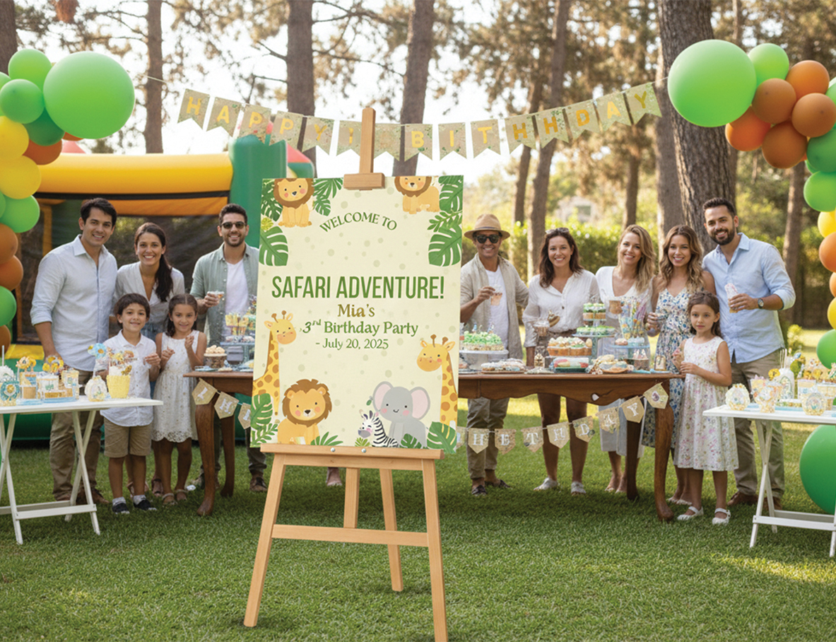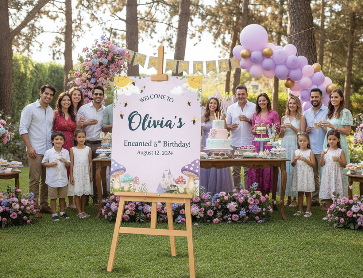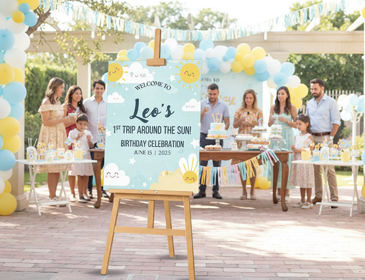 - Welcome Sign Stand with printed birthday board – Ensure guests feel welcomed and informed as they arrive at the event.