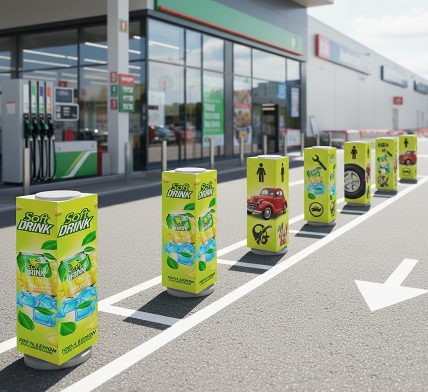 Retail parks often use square bollard sleeves printing for structured branding, while forecourts rely on triangle bollard cover printing for visibility. At events, Toblerone bollard sleeve printing provides multi-angle exposure, ensuring your brand is noticed from every direction.