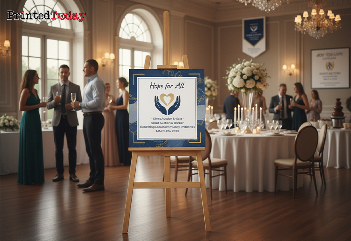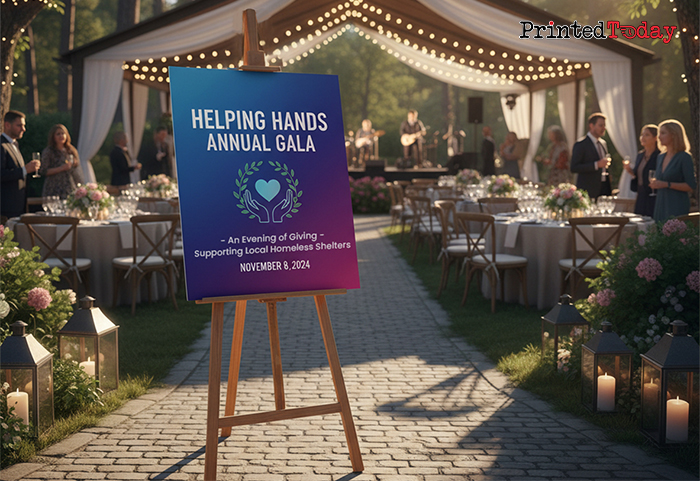 - Fundraising gala easel with printed sign – Ideal for showcasing event schedules at upscale charity galas.