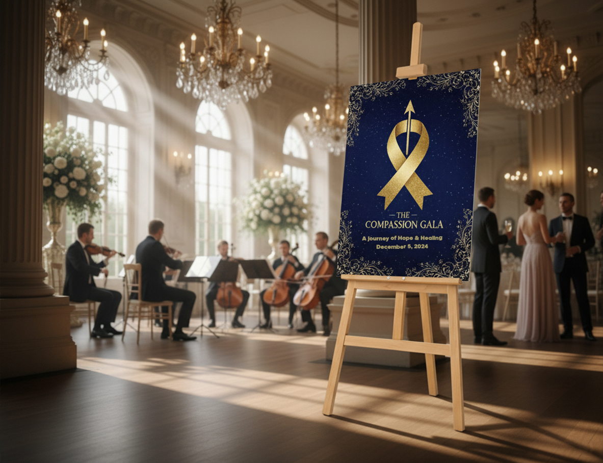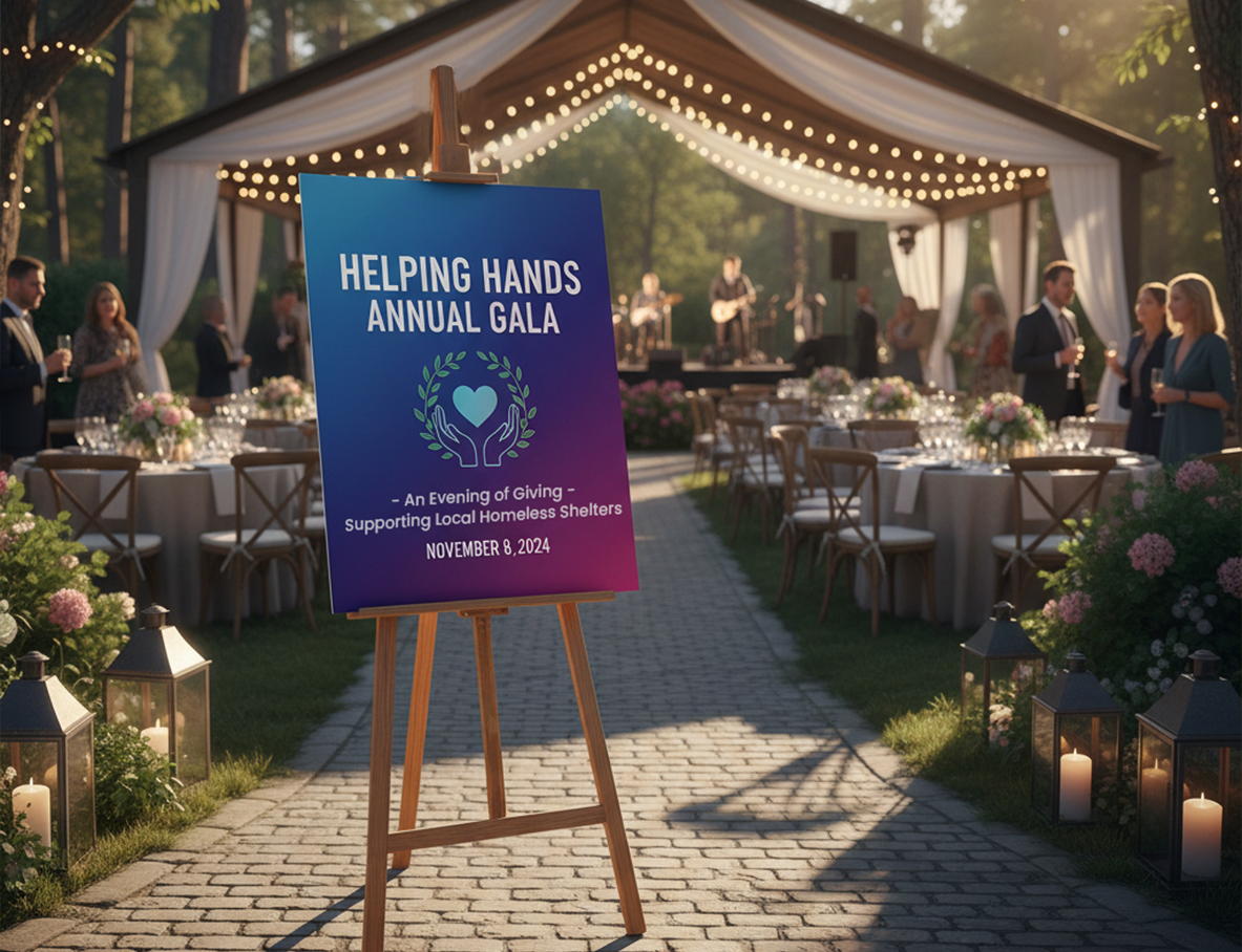 - Charity event wooden easel with printed board – Perfect for creating an impactful entrance display at fundraising dinners.