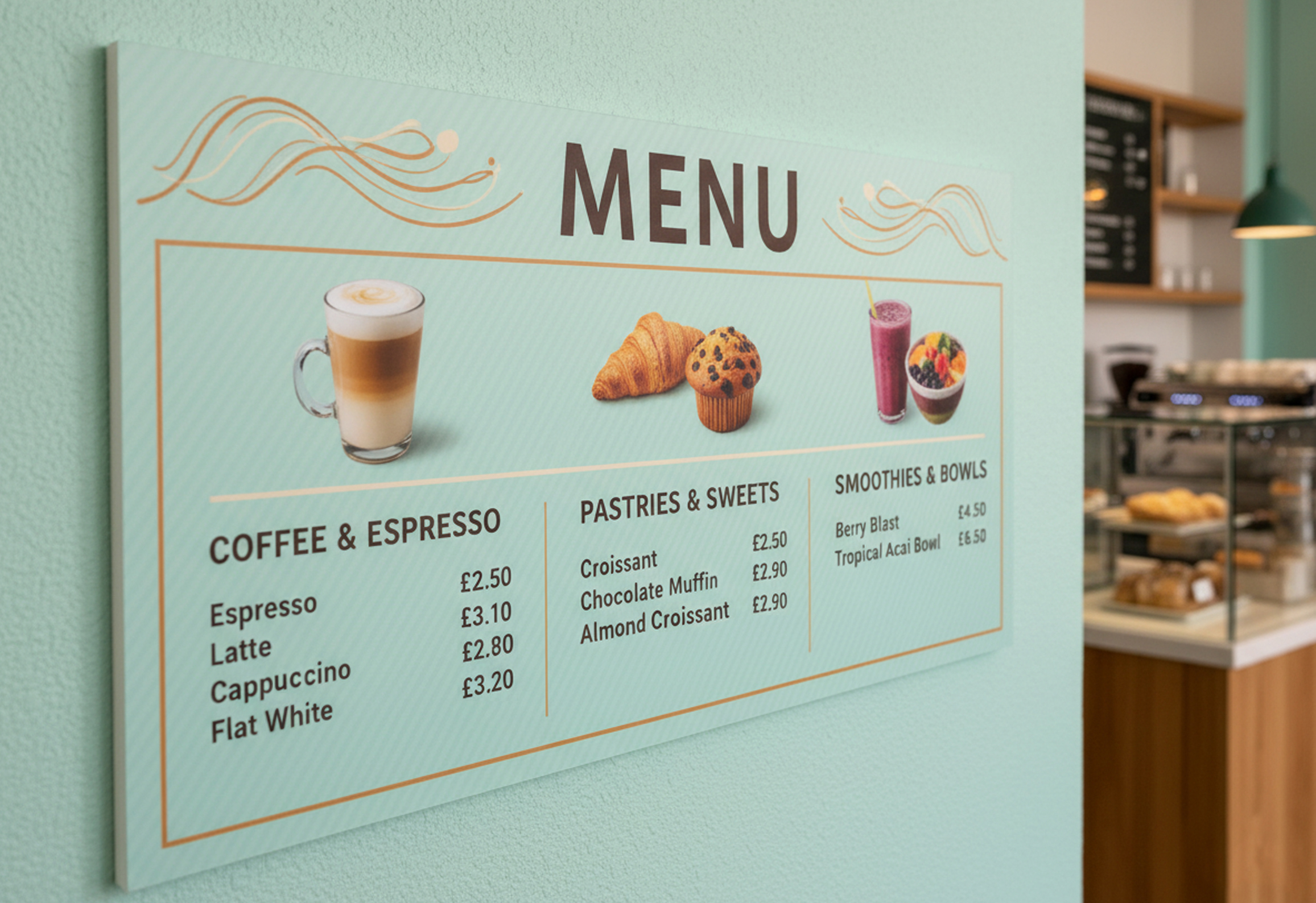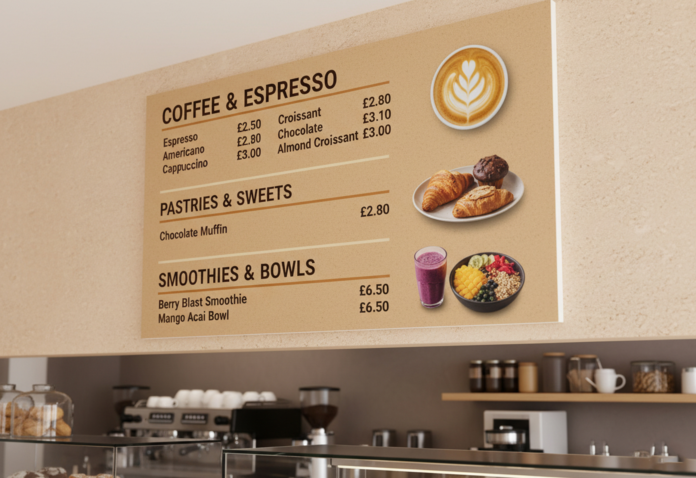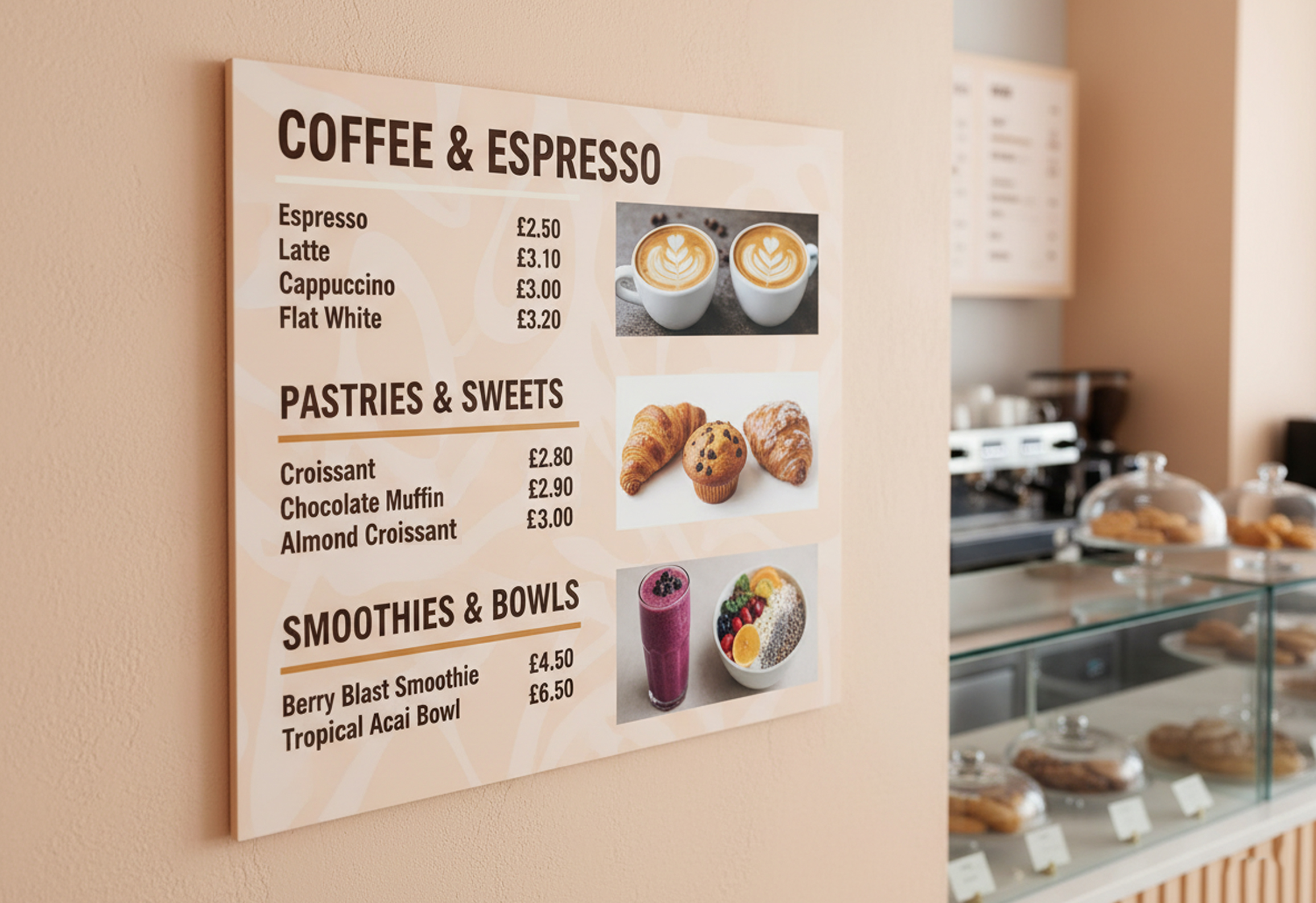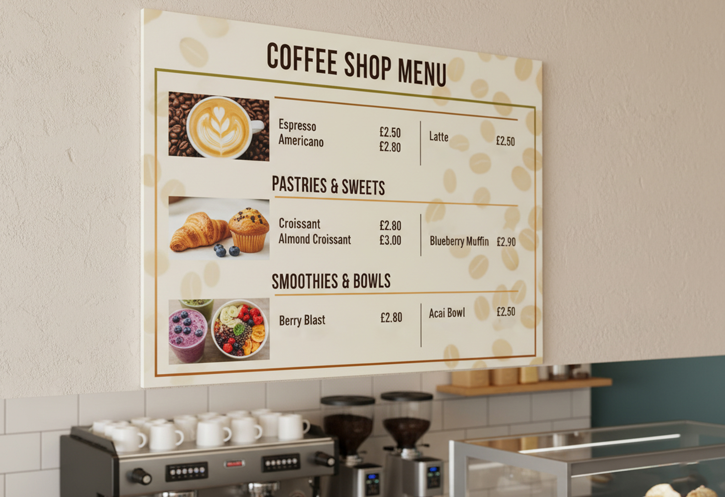 - Café wall menus – clear, organised displays for regular coffee options, seasonal specials, and food pairings mounted behind counters or on feature walls.