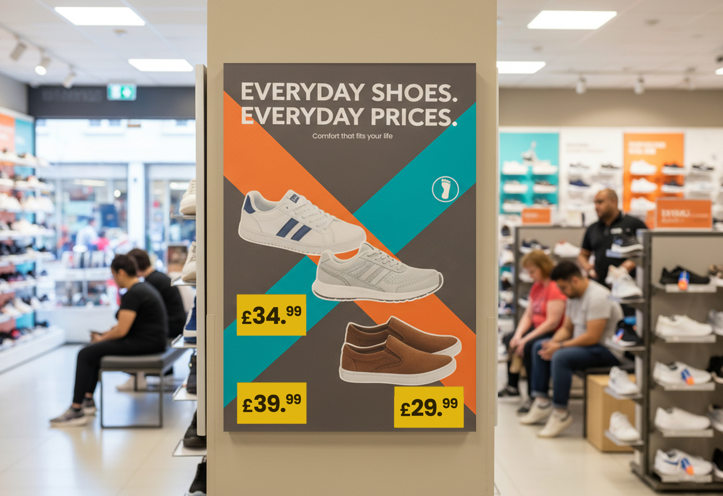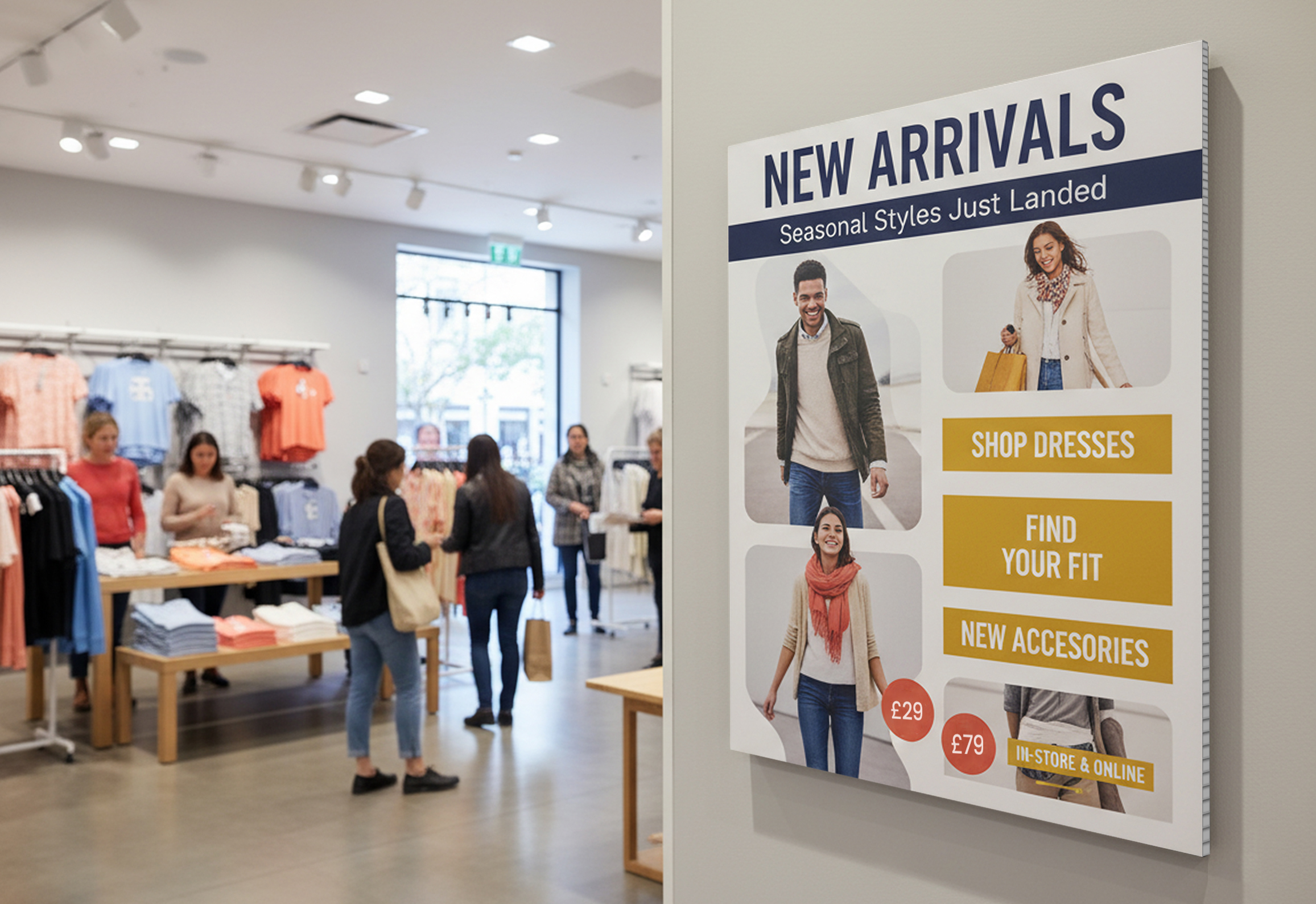- Window display campaigns – eye-catching boards communicating new season arrivals, featured products, promotional offers and brand messaging to attract customers from high streets, shopping centres and retail parks.