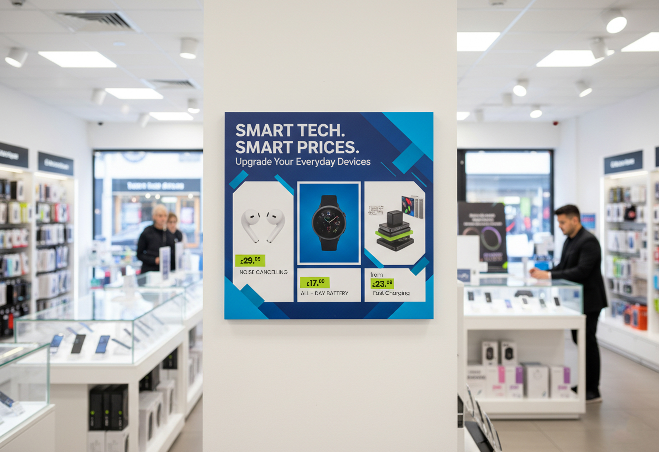 - A1 (594 × 841 mm) – large-format boards for major promotional campaigns, seasonal displays, new product launches and ceiling-suspended signage dominating retail spaces with maximum brand presence.