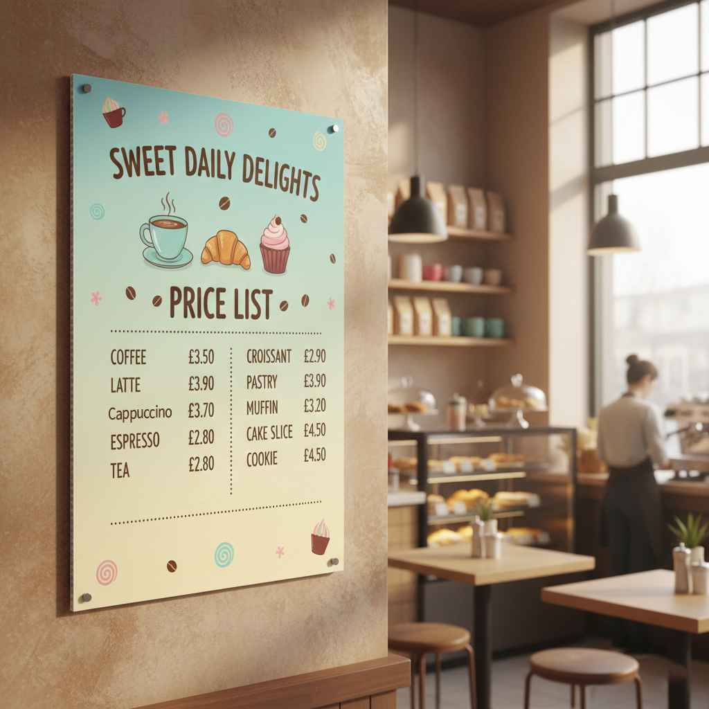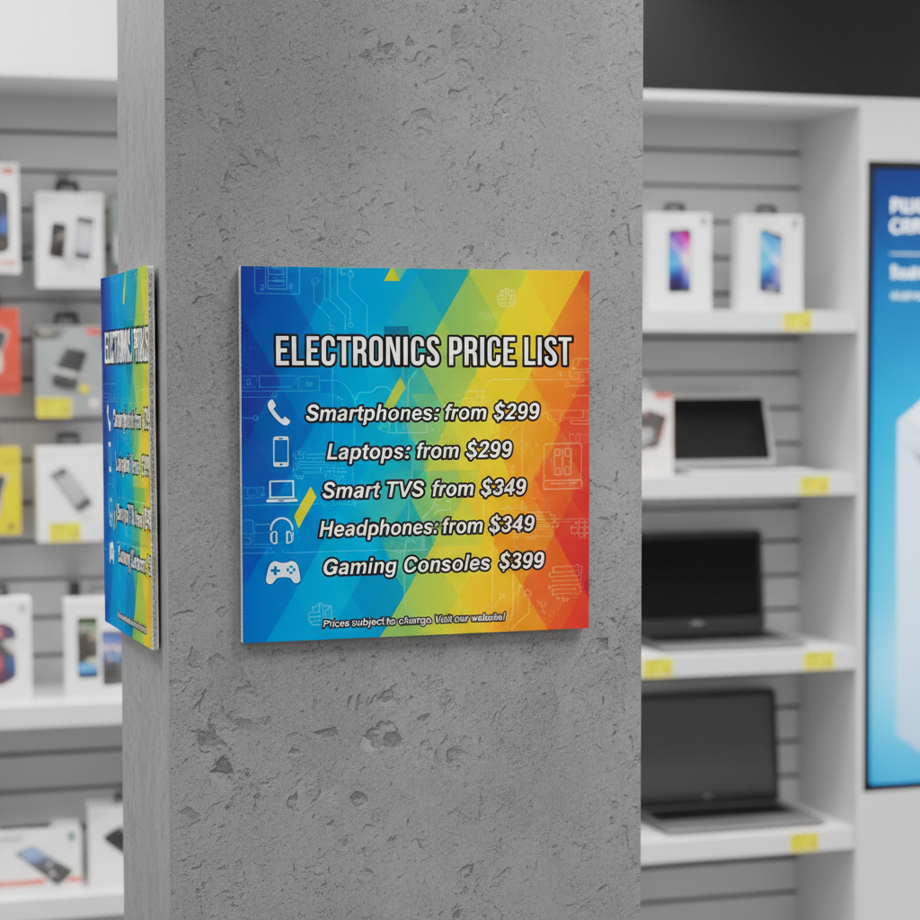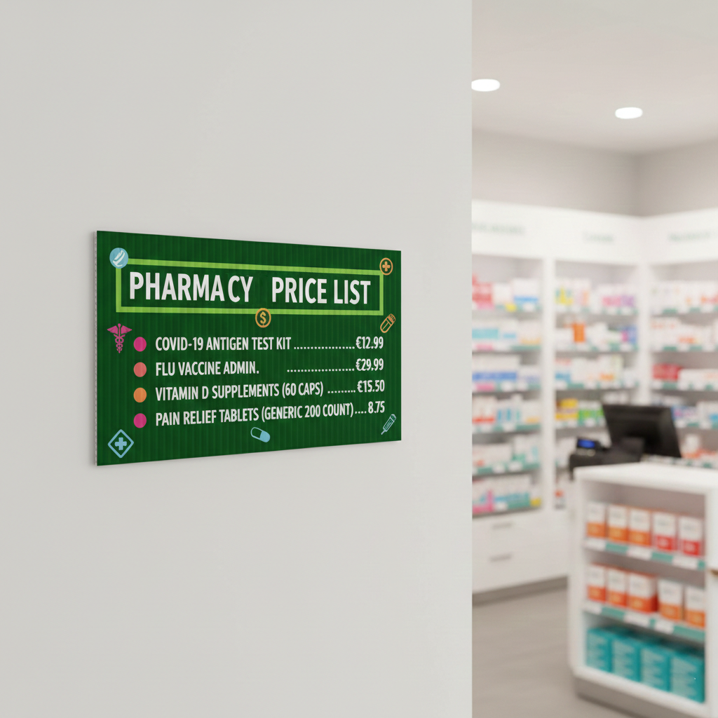 We use industry-standard 4 mm fluted polypropylene sheets for lightweight, durable and easy-to-position price signage. For premium displays or double-sided hanging boards, 8 mm correx is also available upon request. Every offer signage job is produced using UV-cured or solvent-based inks to ensure maximum colour vibrancy, sharp price legibility and scratch resistance throughout sale periods and promotional campaigns.