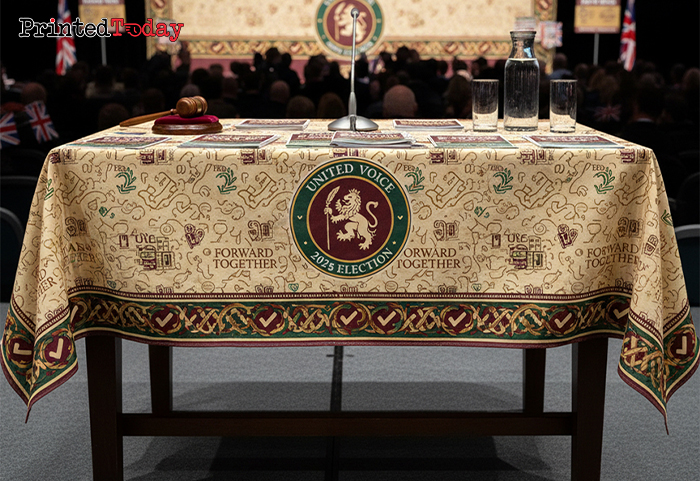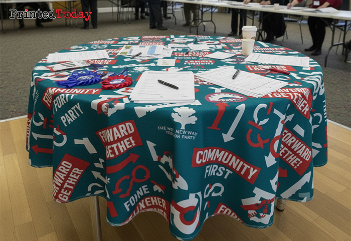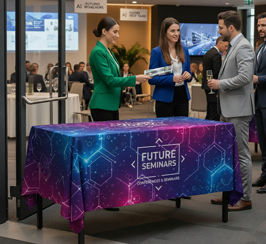 - Media coverage – custom table cloths ensure professionalism in photos and videos.