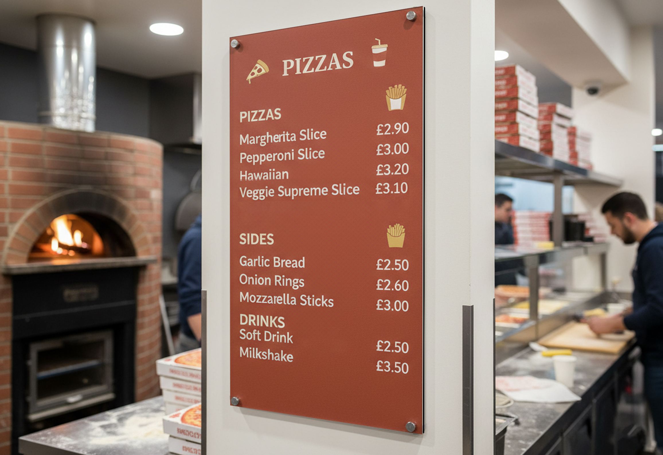 A: Our dibond menu boards are available in a range of sizes, from compact A4 for smaller displays to large A0 for more prominent visibility. Custom dimensions are also available to fit specific needs and spaces, ensuring your menu board perfectly complements your establishment.