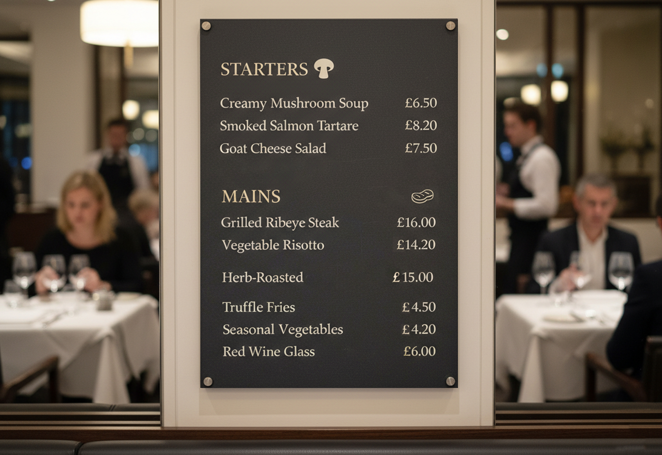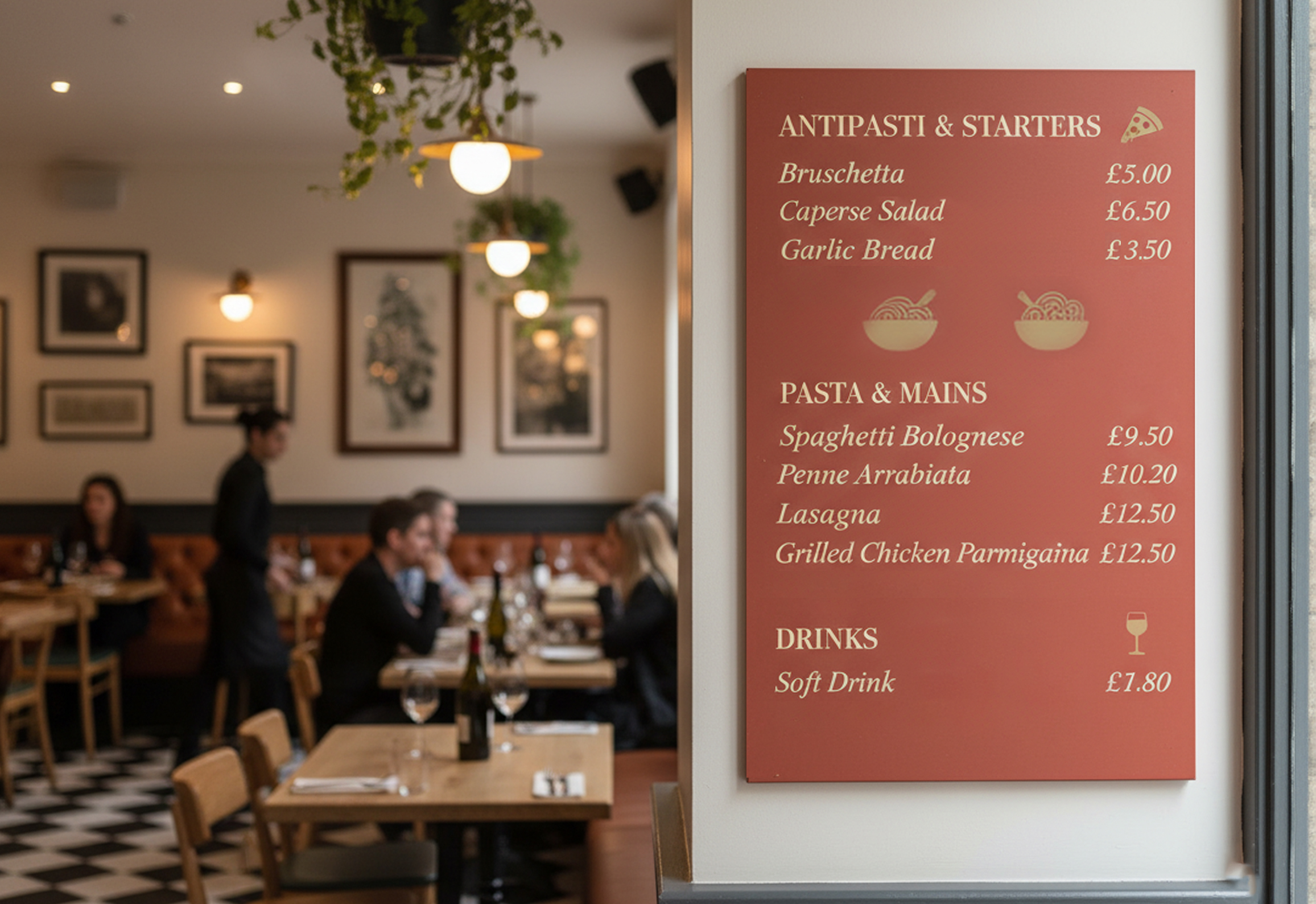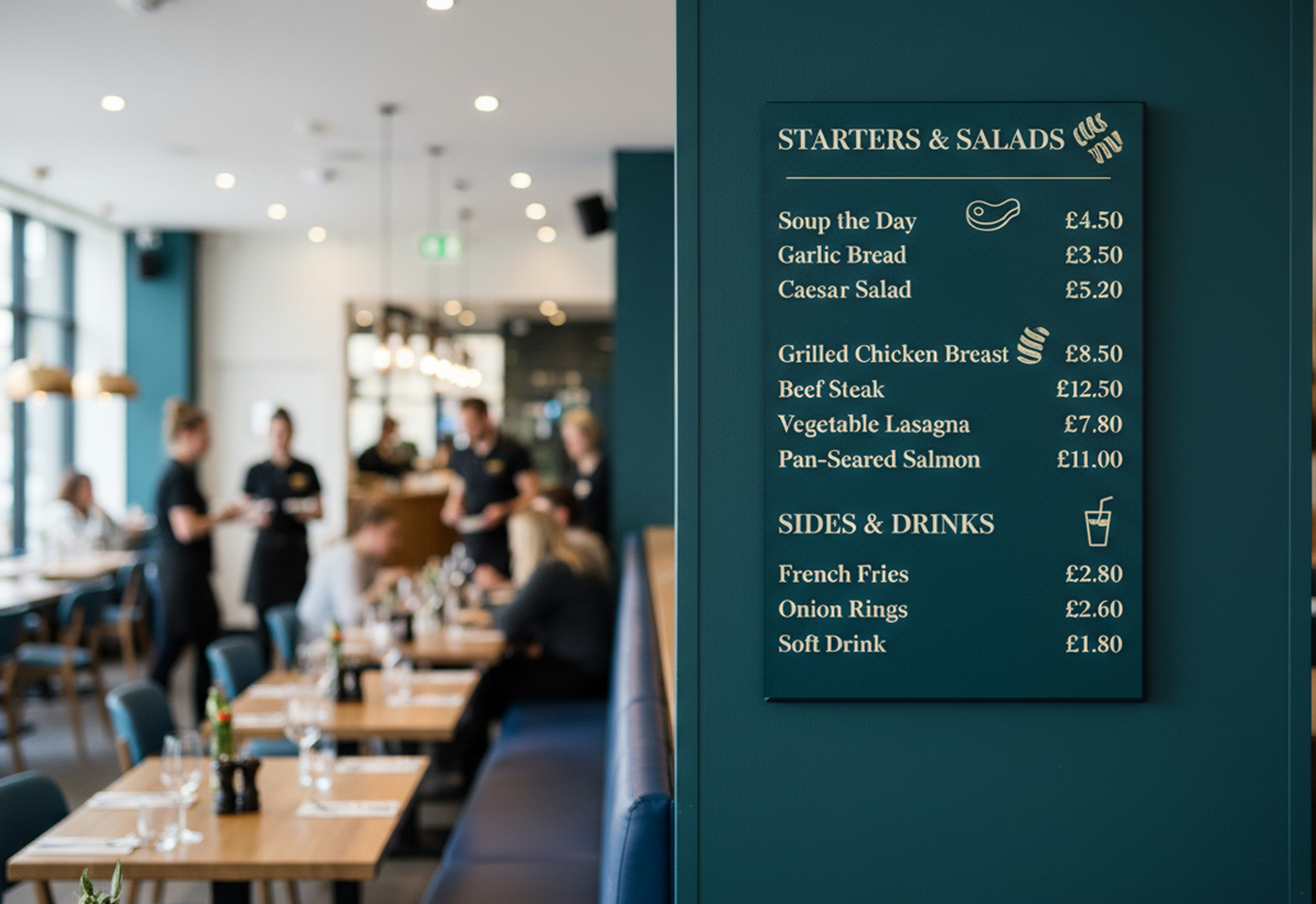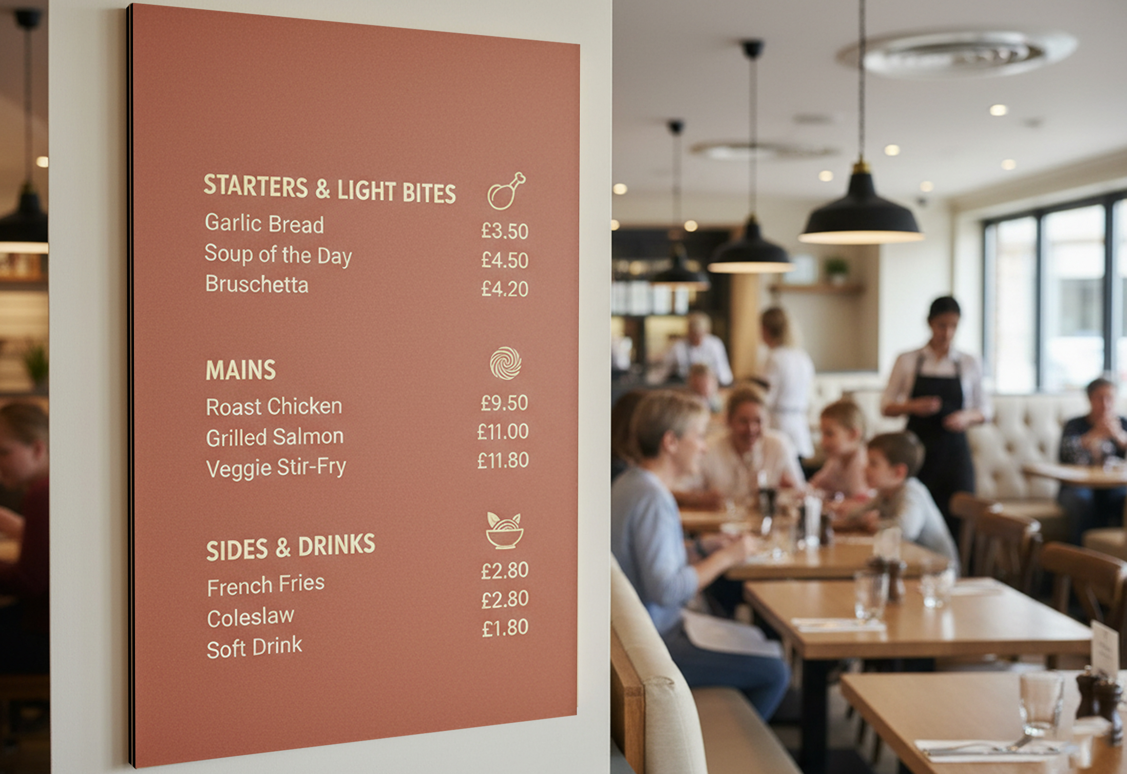 - Indoor menu boards – Durable and stylish options for showcasing your menu inside restaurants, cafés, and bistros.