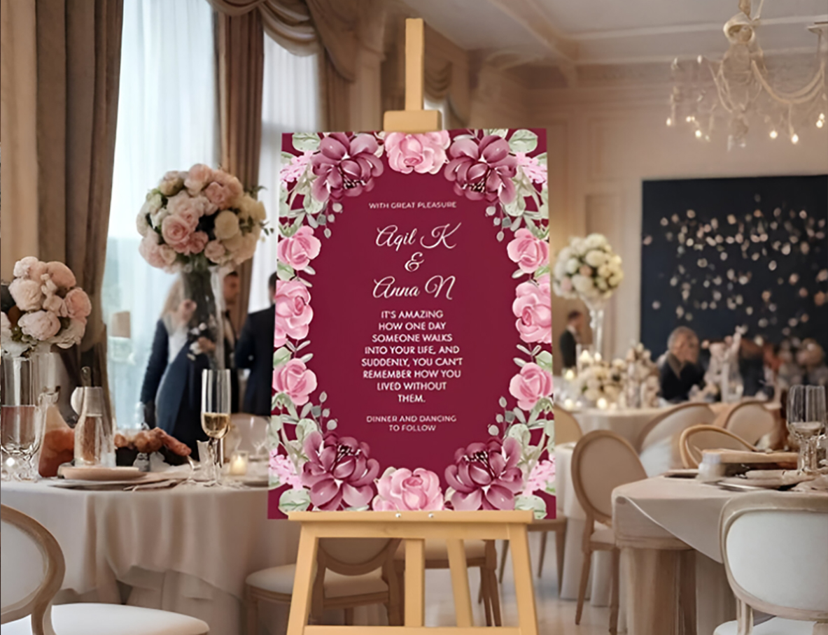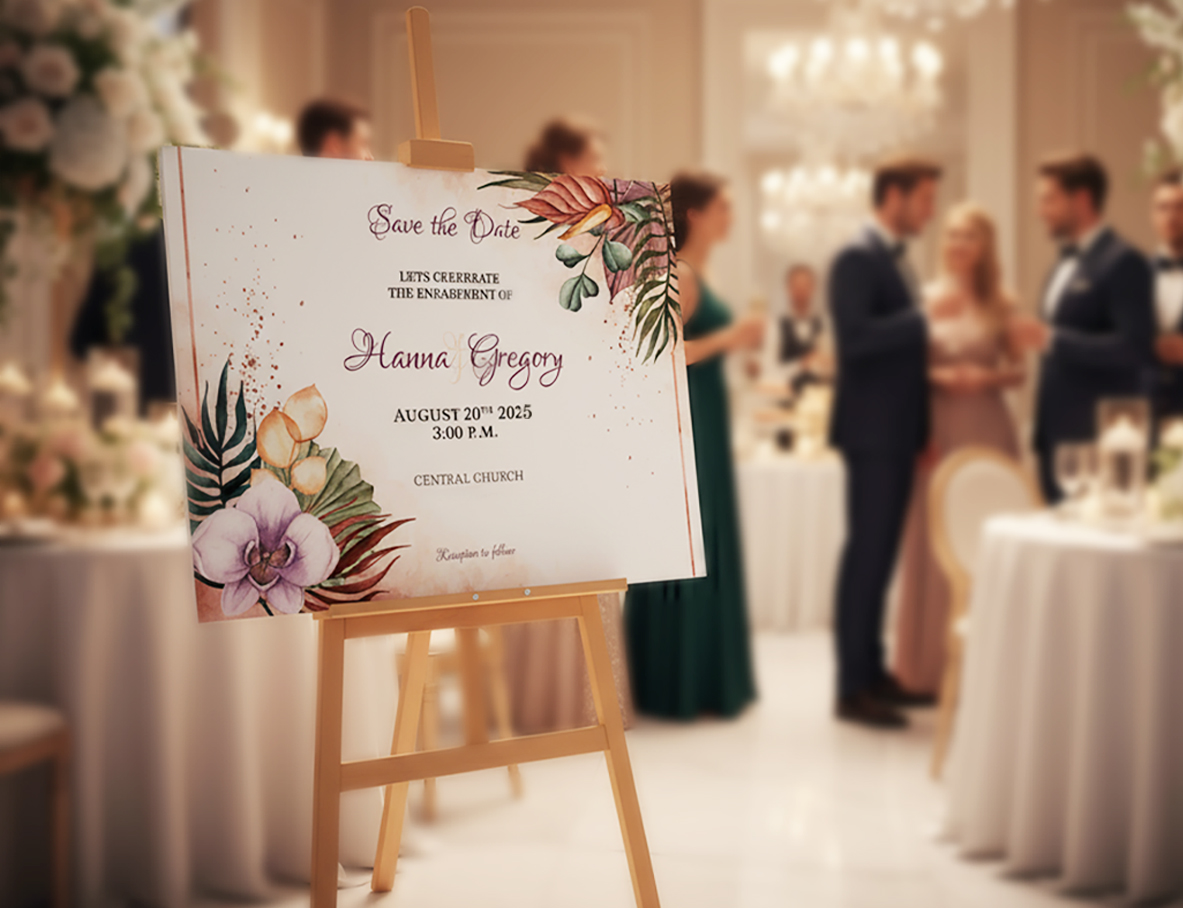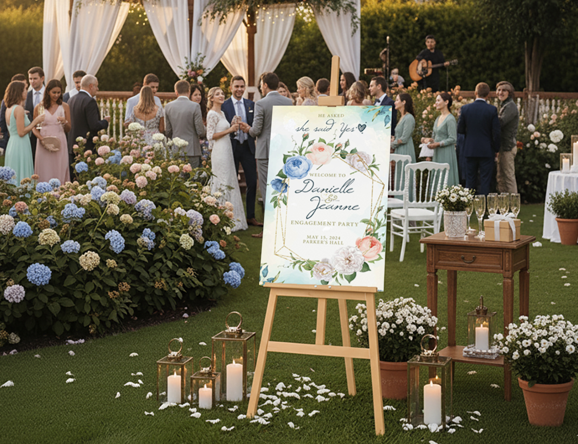 - Guide your attendees effortlessly with a wooden easel with printed engagement welcome board, ensuring everyone knows where to head next.