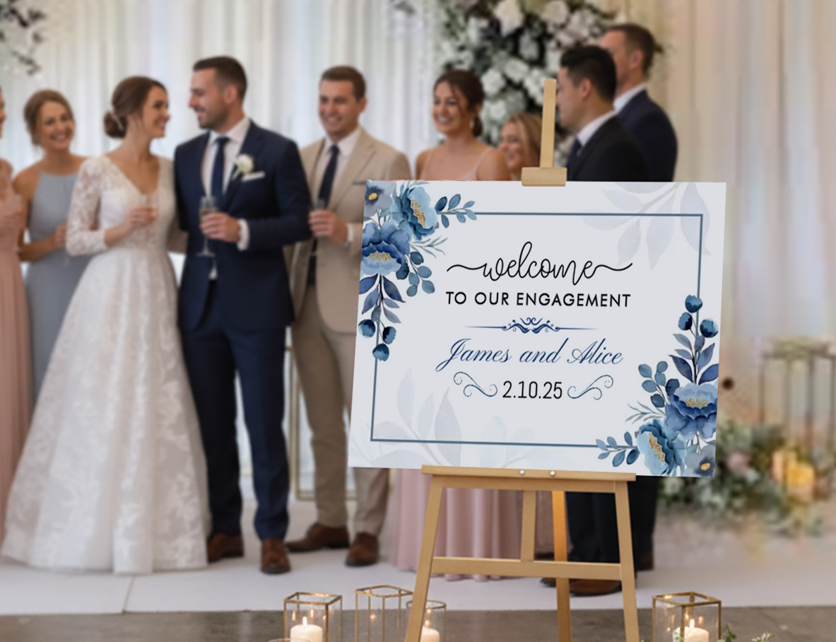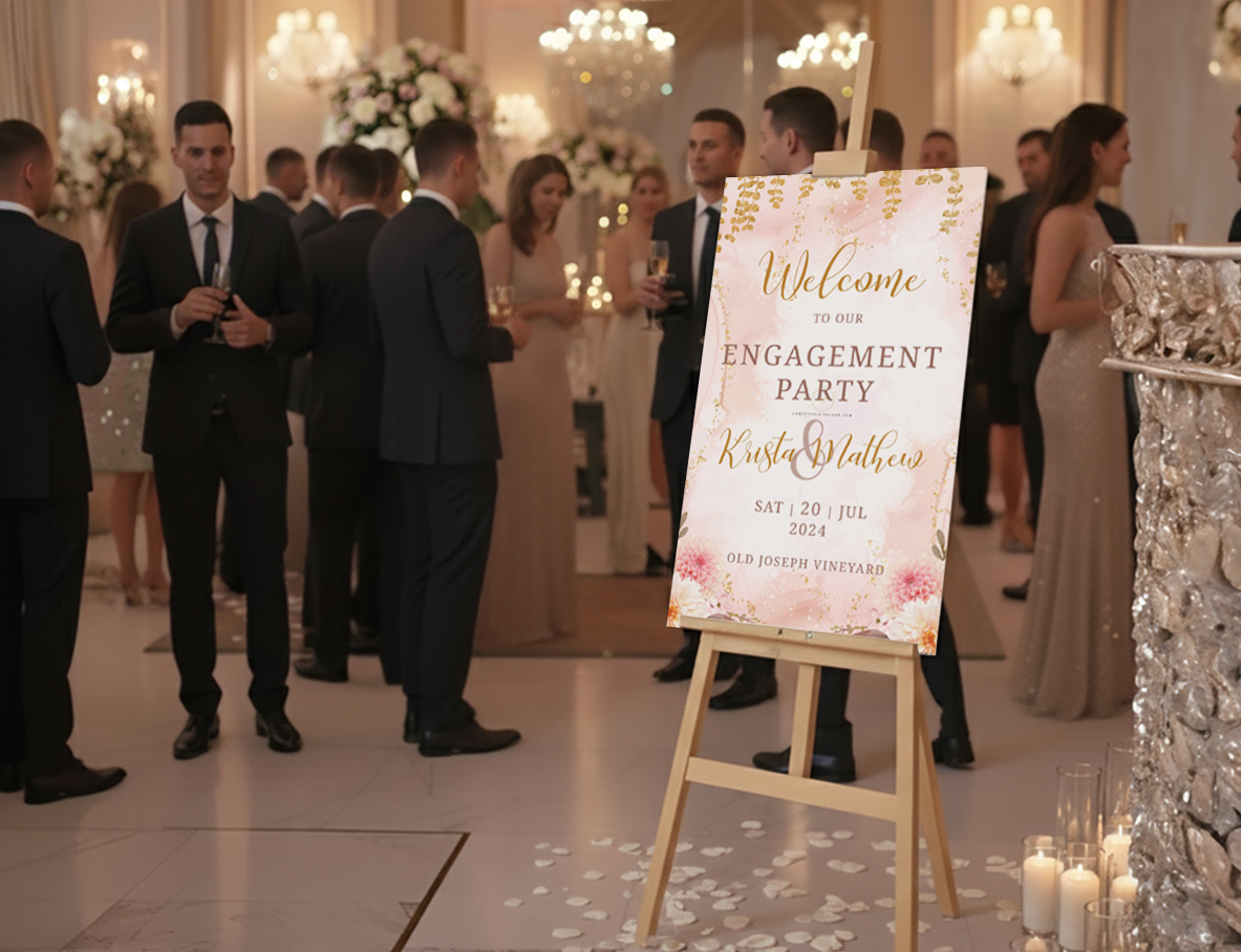- Use an engagement welcome sign stand with printed board to direct guests to key areas like cocktail lounges or dining spaces.