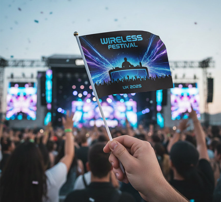 Event materials must withstand enthusiastic handling whilst maintaining attractive appearance throughout occasion duration and beyond when attendees retain flags as keepsakes. Our 195gsm knitted polyester balances durability with lightweight comfort enabling extended waving without arm fatigue whilst surviving repeated handling without developing shabby appearance. Waterproof event hand waving flags survive British weather without deterioration ensuring event continuity regardless of weather developments whilst quick-drying properties maintain comfortable handling. UV-resistant inks prevent fading ensuring flags photographed throughout events and retained afterwards maintain colour vibrancy in shared social content and displayed memorabilia creating ongoing positive associations with event experiences.