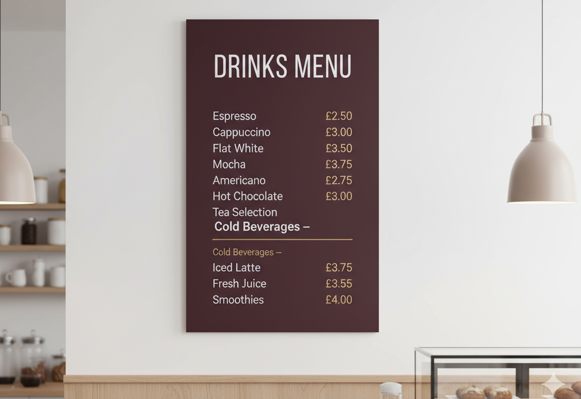 - Restaurant & café wall menus – main dining menus, specials boards, wine lists and dessert displays mounted behind counters or on feature walls.