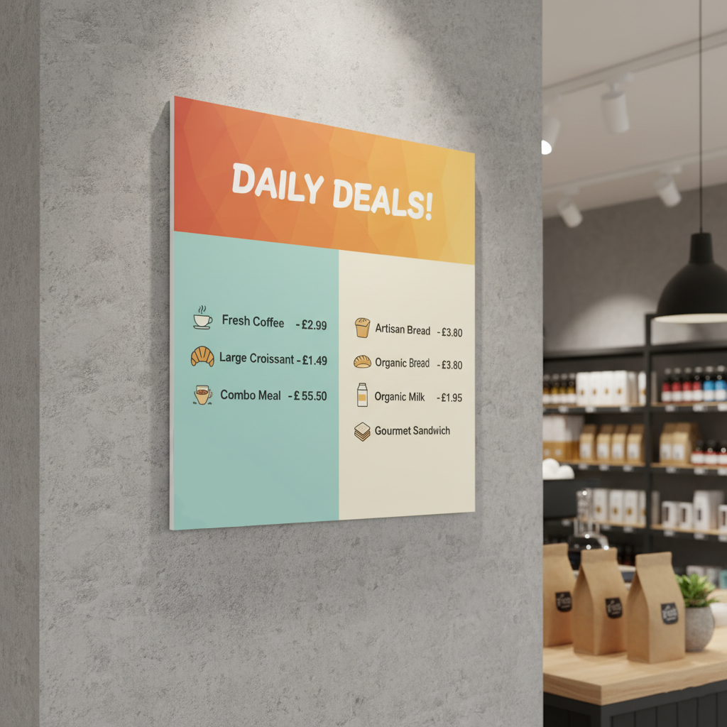 Printed Today offers top-notch Foamex Price List Board Printing services tailored for businesses across the UK. Our rigid price list boards are crafted from premium PVC foam sheets, ensuring durability and a professional look for any setting. Whether you need a single board or a full suite of indoor price list signage, our service allows complete customisation in size, finish, and delivery speed to meet your specific needs.