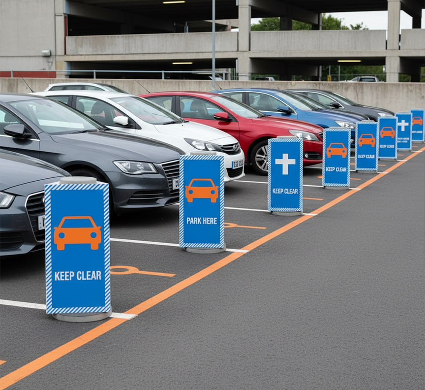 In forecourts, fuel station forecourt bollard sleeves enhance visibility for promotions. Retail parks use forecourt triangle bollard covers for directional signage. Gyms and supermarkets rely on square sleeves for advertising, while events benefit from Toblerone styles for three-sided branding.