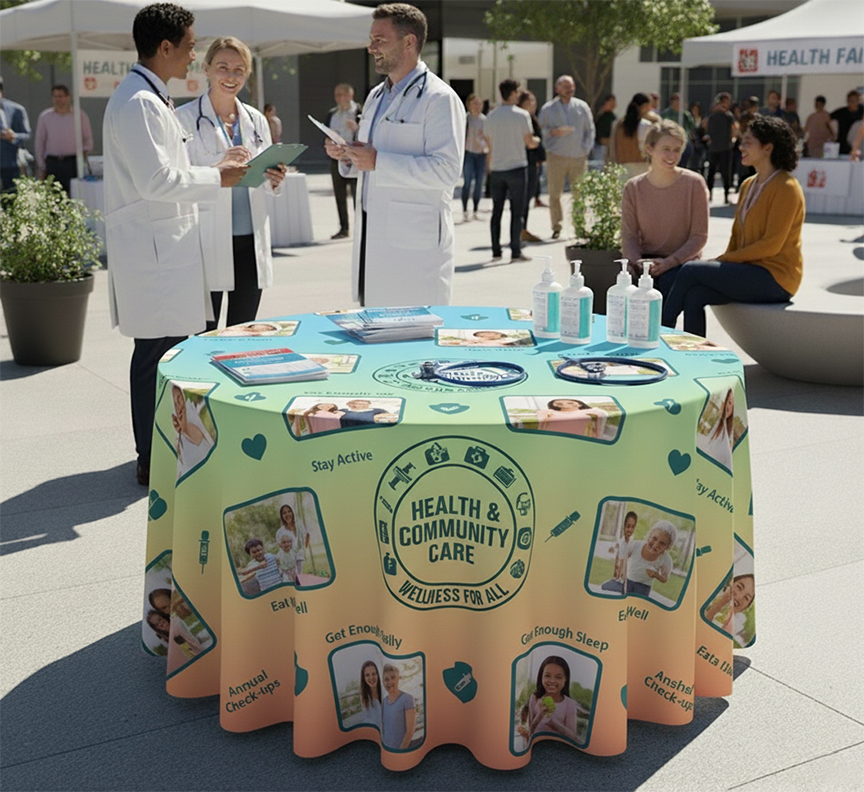 - Healthcare facilities – enhance patient and visitor areas with healthcare printed tablecloths that reflect your dedication to care.