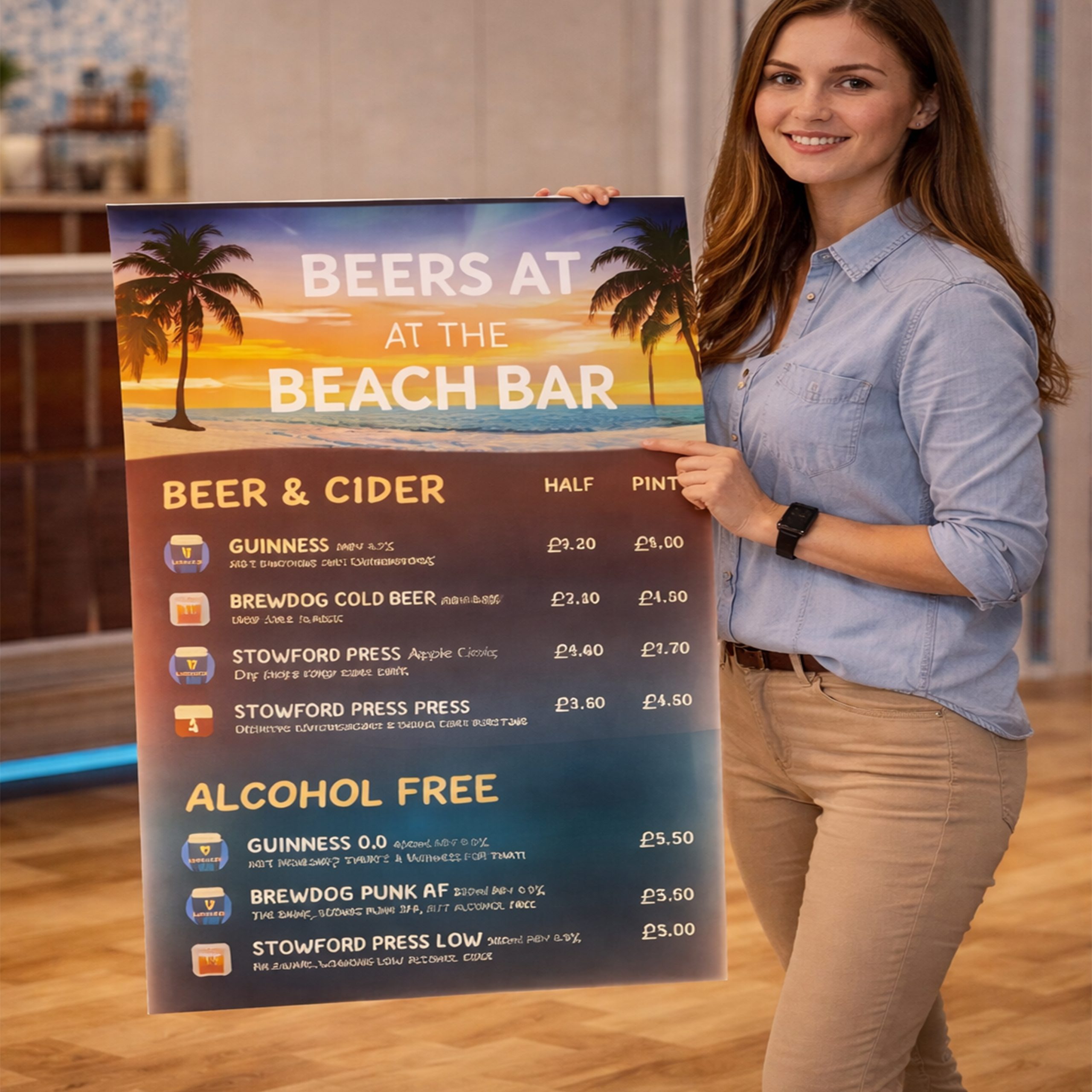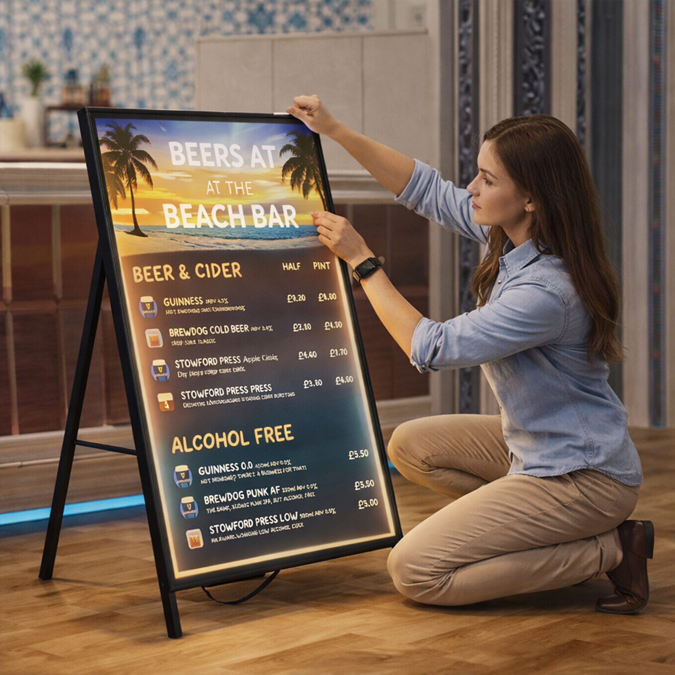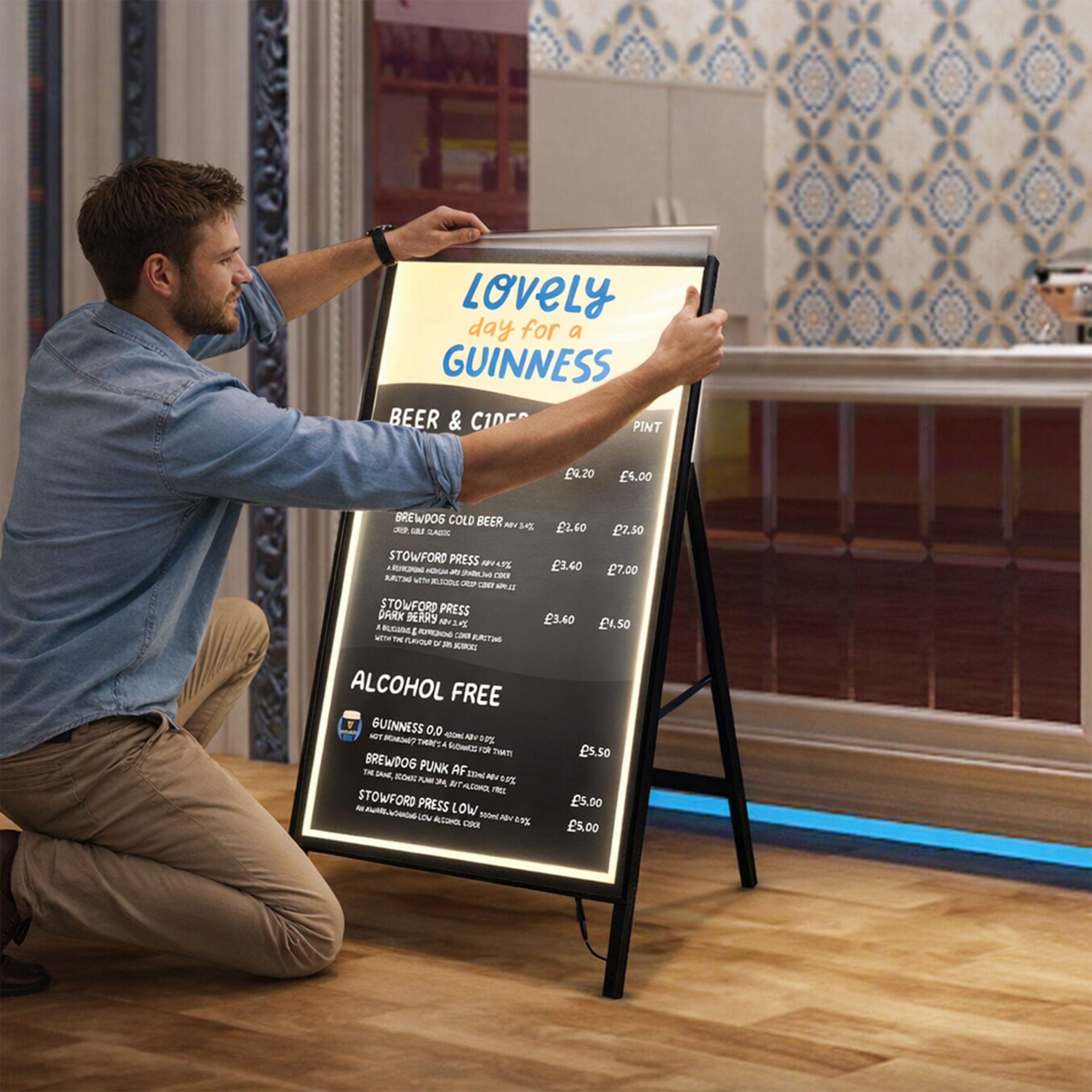 These backlit replacement posters are specifically produced to fit standard 600×900 LED A-Frame light displays. Designed for edge-lit illumination systems, the graphics allow light to distribute evenly across the panel, ensuring your branding remains crisp, vibrant, and highly visible.