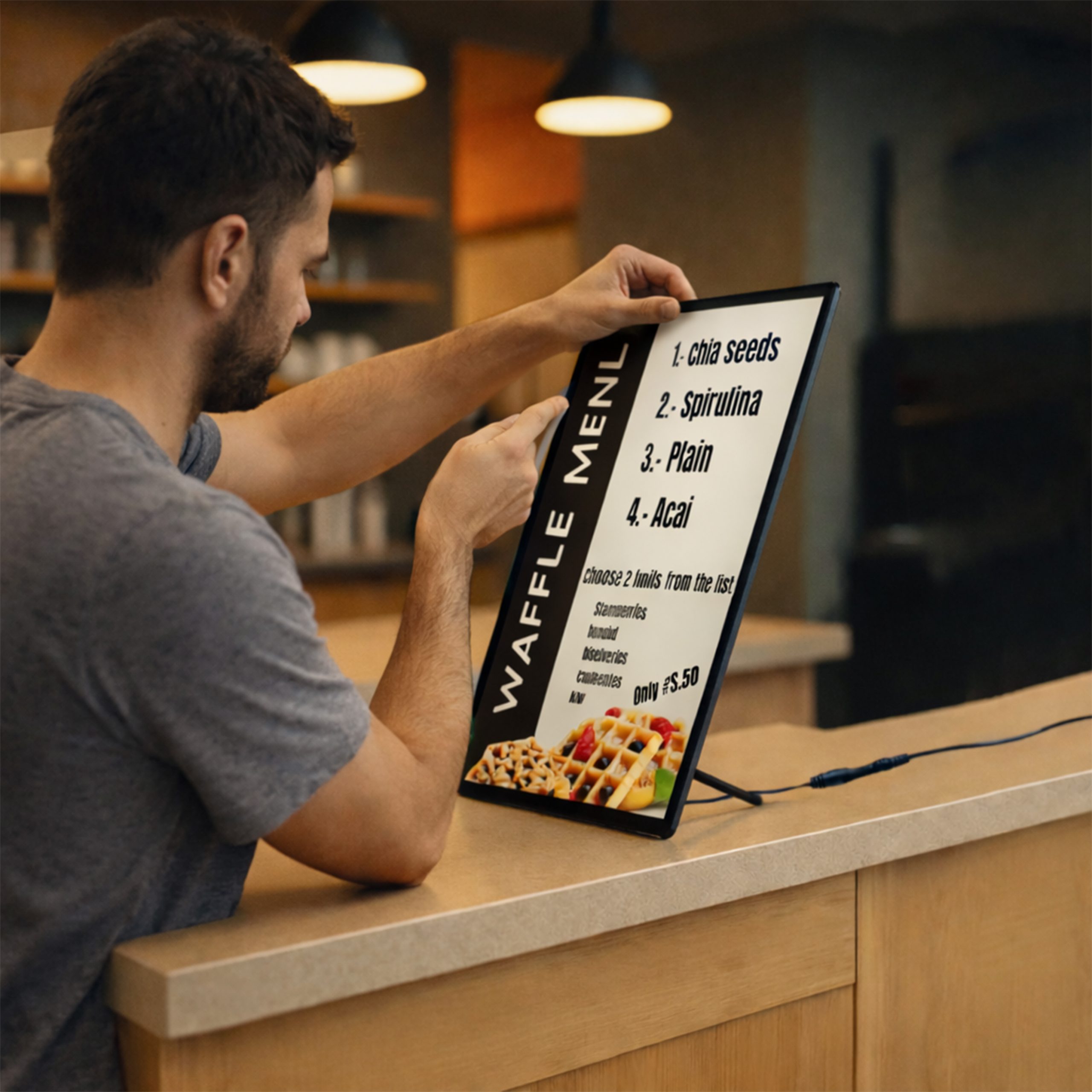 - Easy Slide-In Replacement Print – quick to change daily promotions