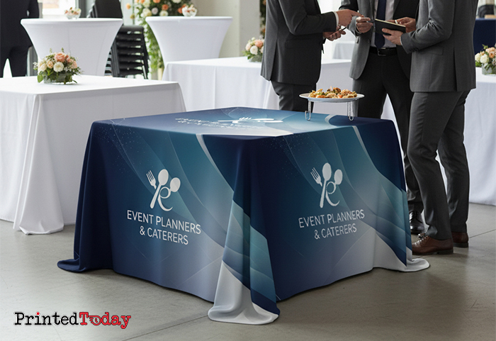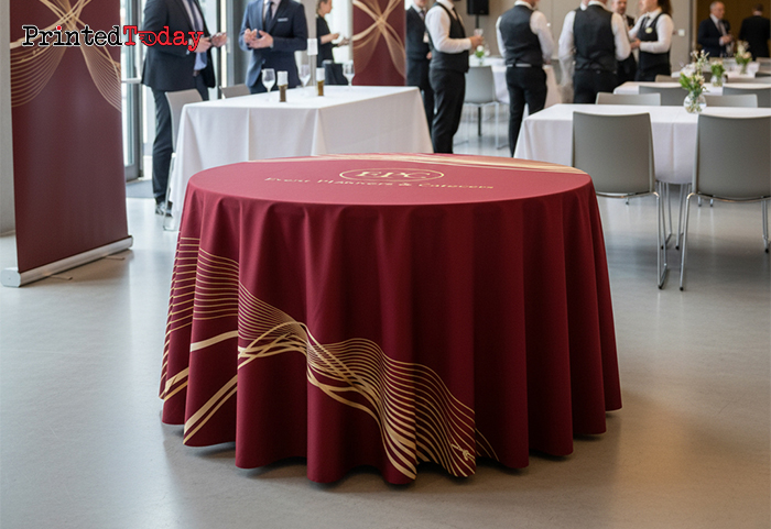 - Corporate events and conferences – keep rooms and stages consistent with a conference logo table cover that photographs cleanly.