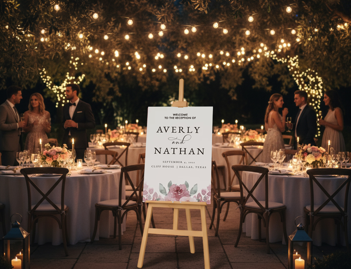 - Welcome Sign Stand with printed sign – Ideal for greeting guests at weddings or events, providing a welcoming message or guiding attendees to the right location.