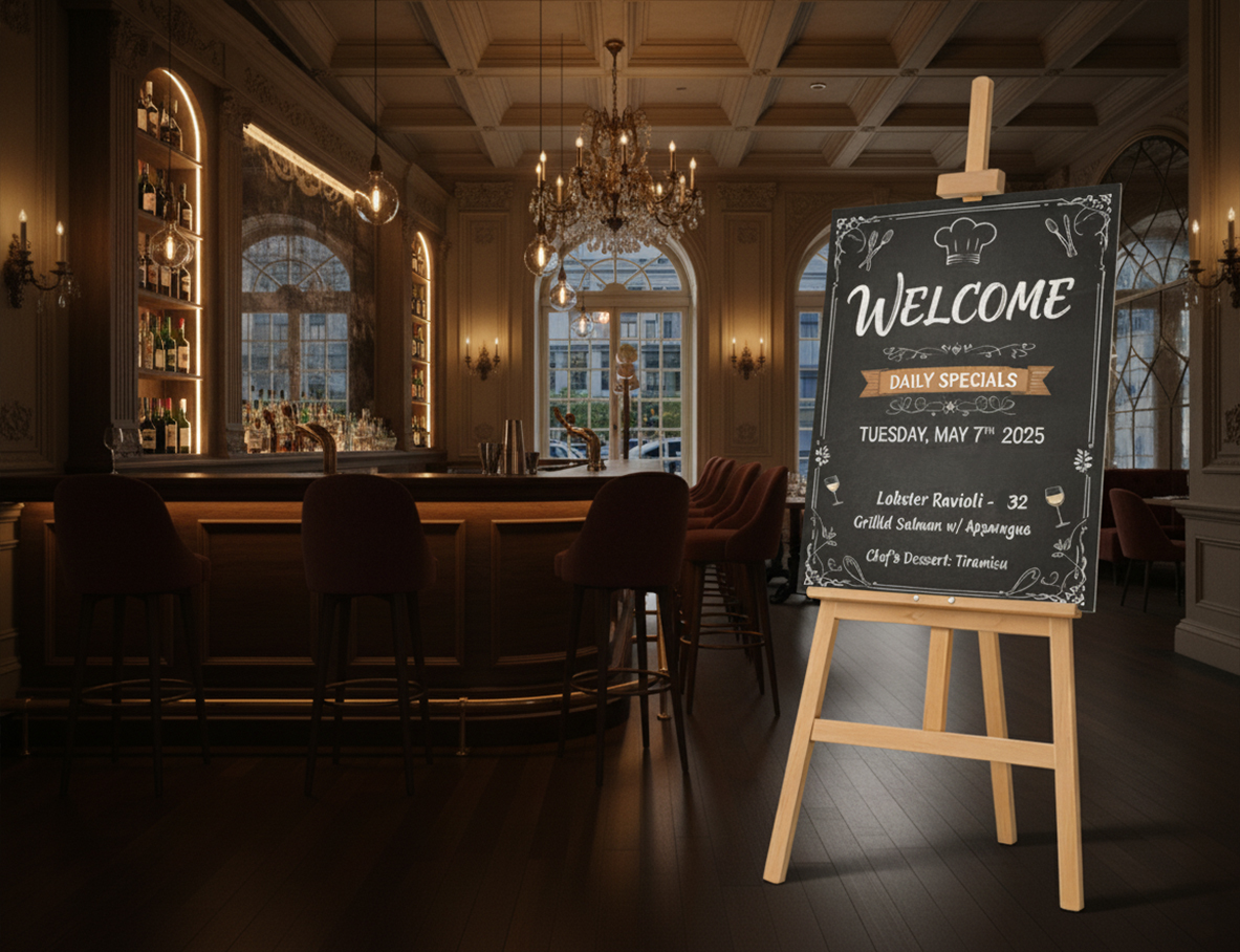 - Capture customer attention with a wooden easel for printed restaurant sign that highlights promotions at the entrance.