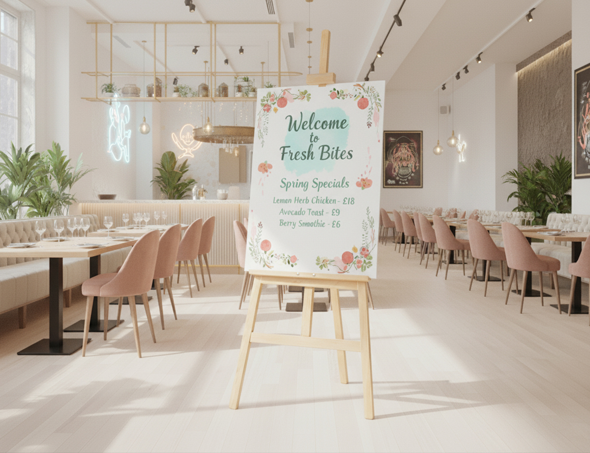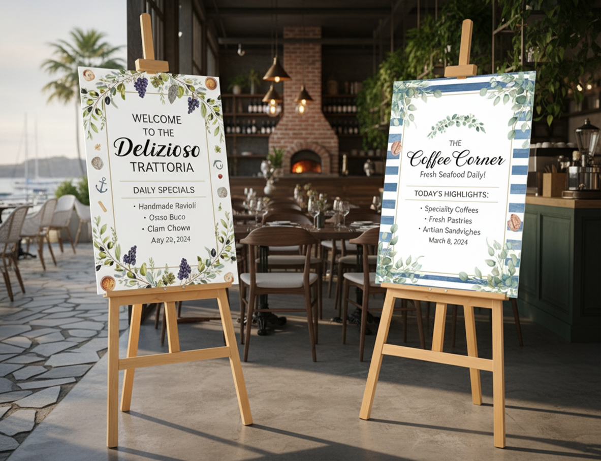 - Create a warm welcome with a café wooden easel with printed menu graphics that invites customers inside.