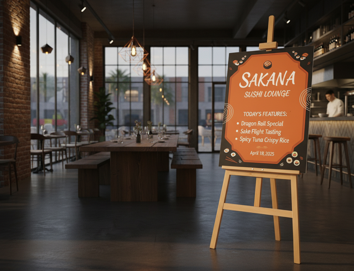 - Offer detailed options on a restaurant signage stand with printed menu board that showcases wine pairings or dessert selections.