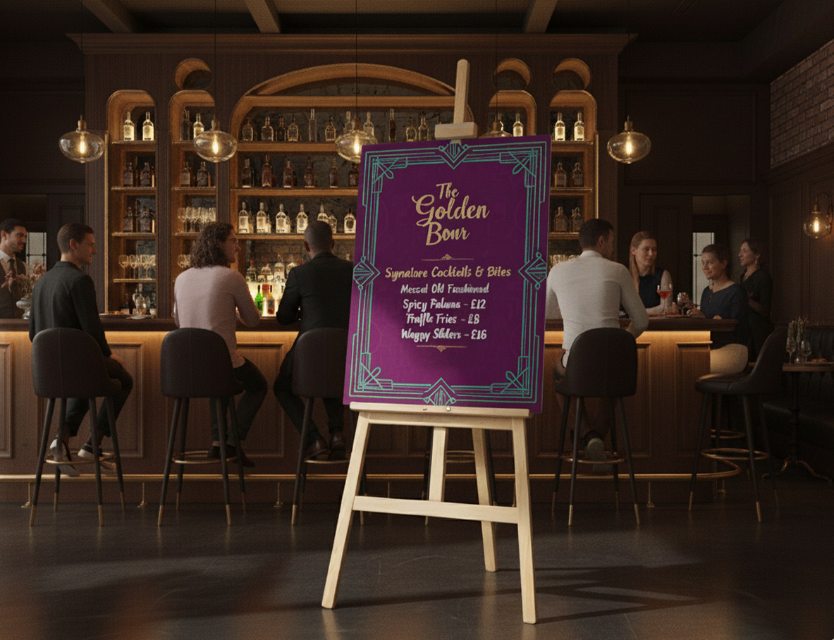 - Highlight events with a Poster Stand with printed menu board that advertises live music or themed nights.