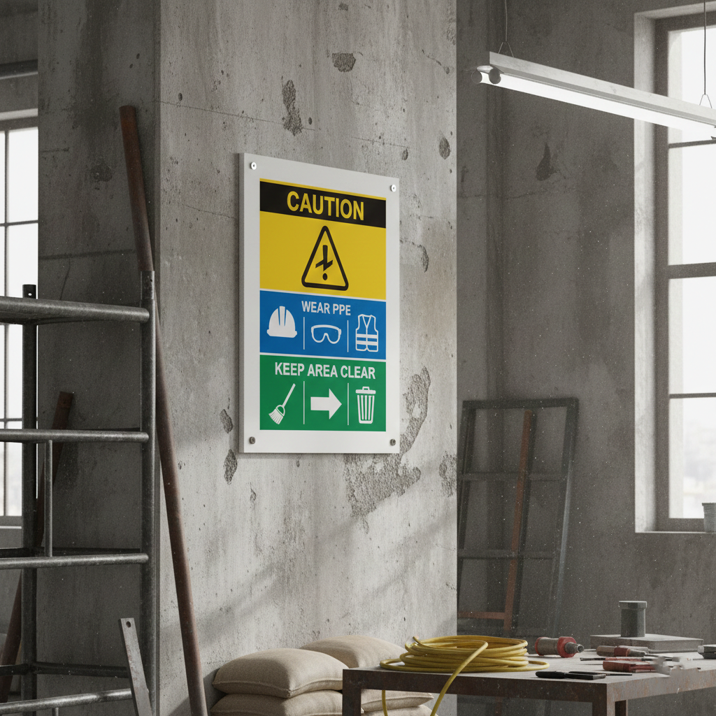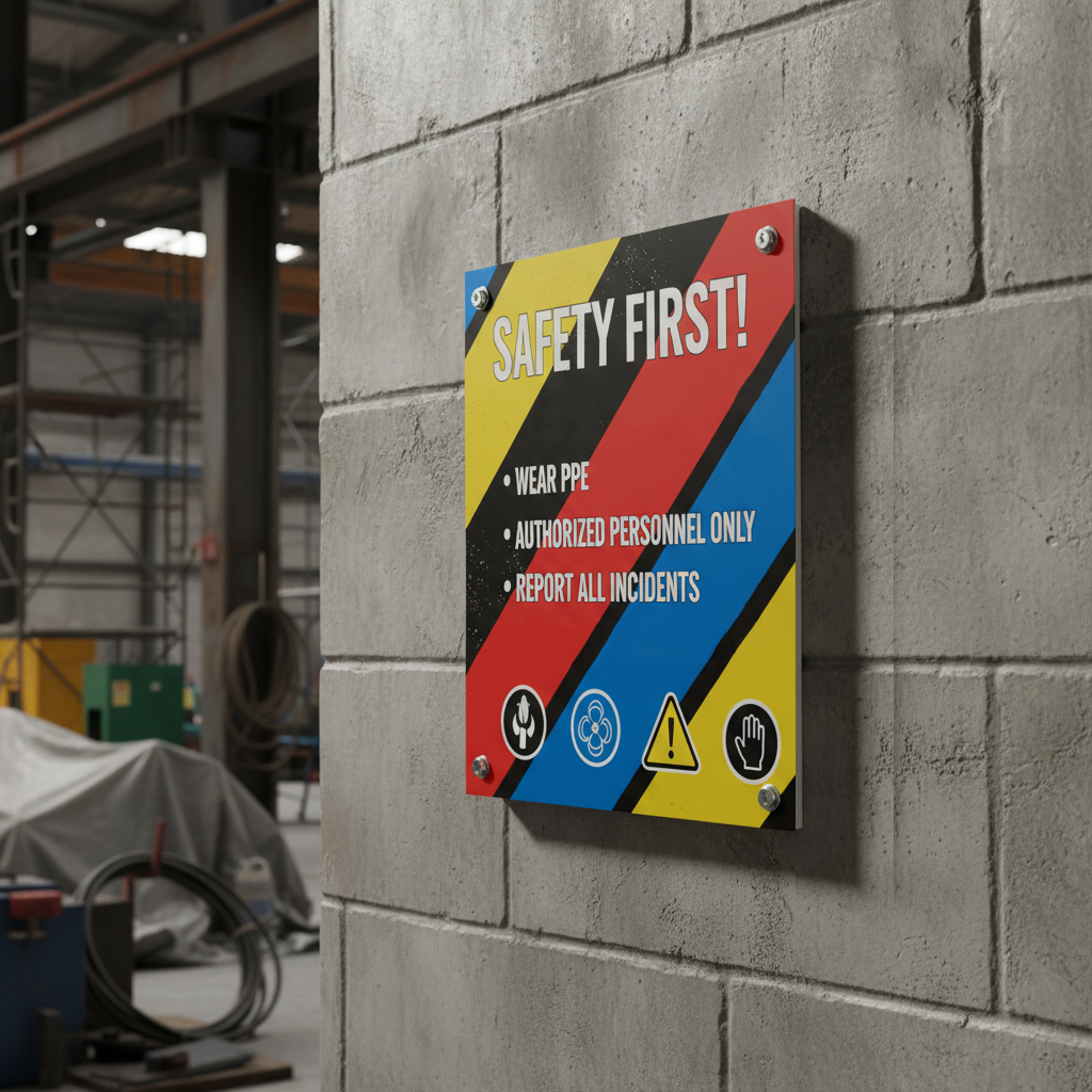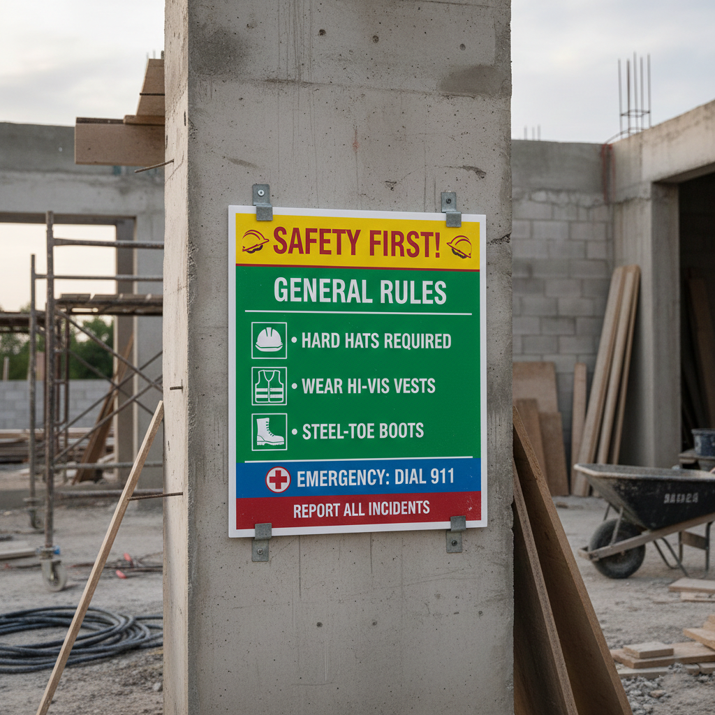 - Construction site safety signs – durable and weather-resistant boards for outdoor use, detailing safety gear requirements and site rules.