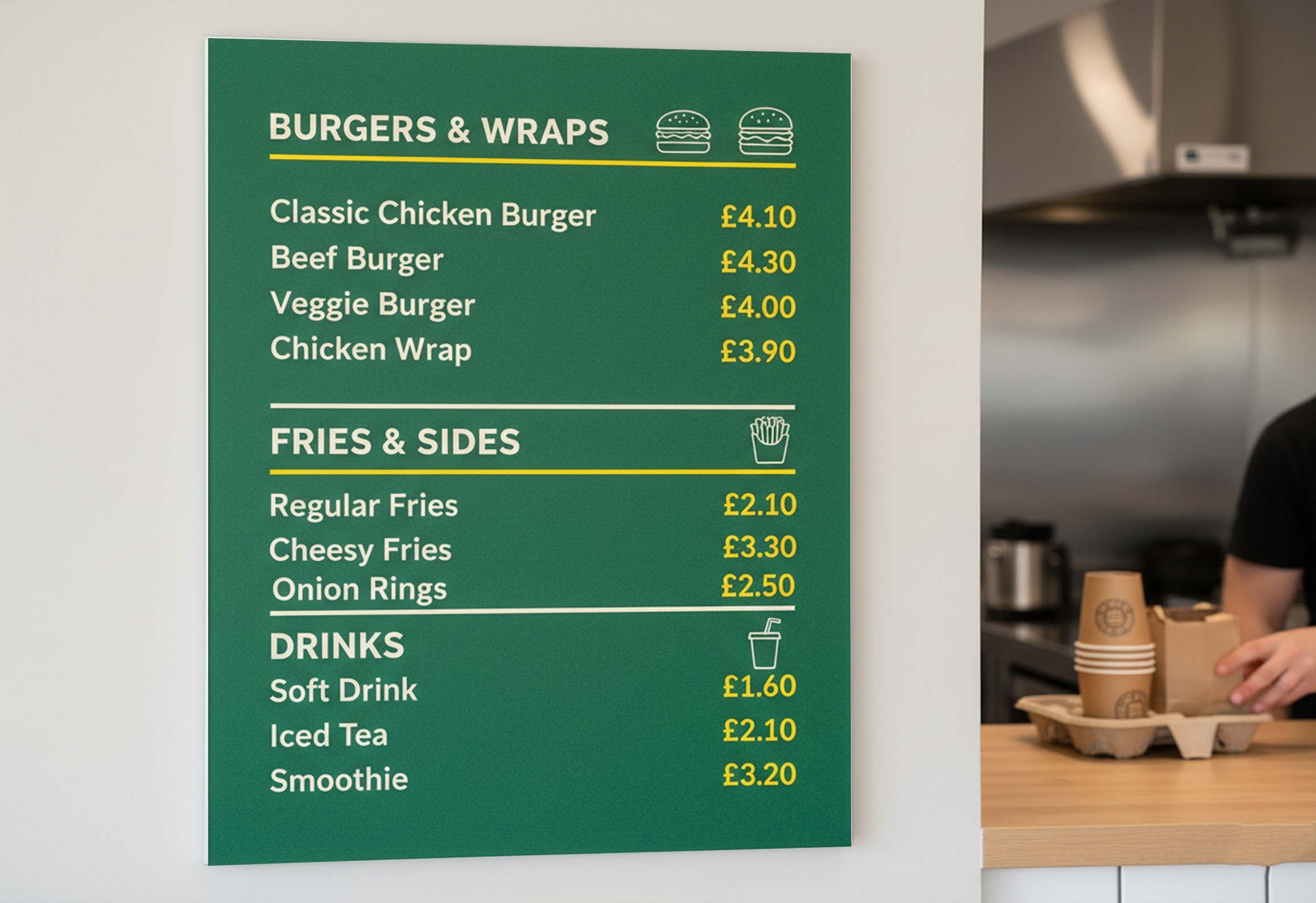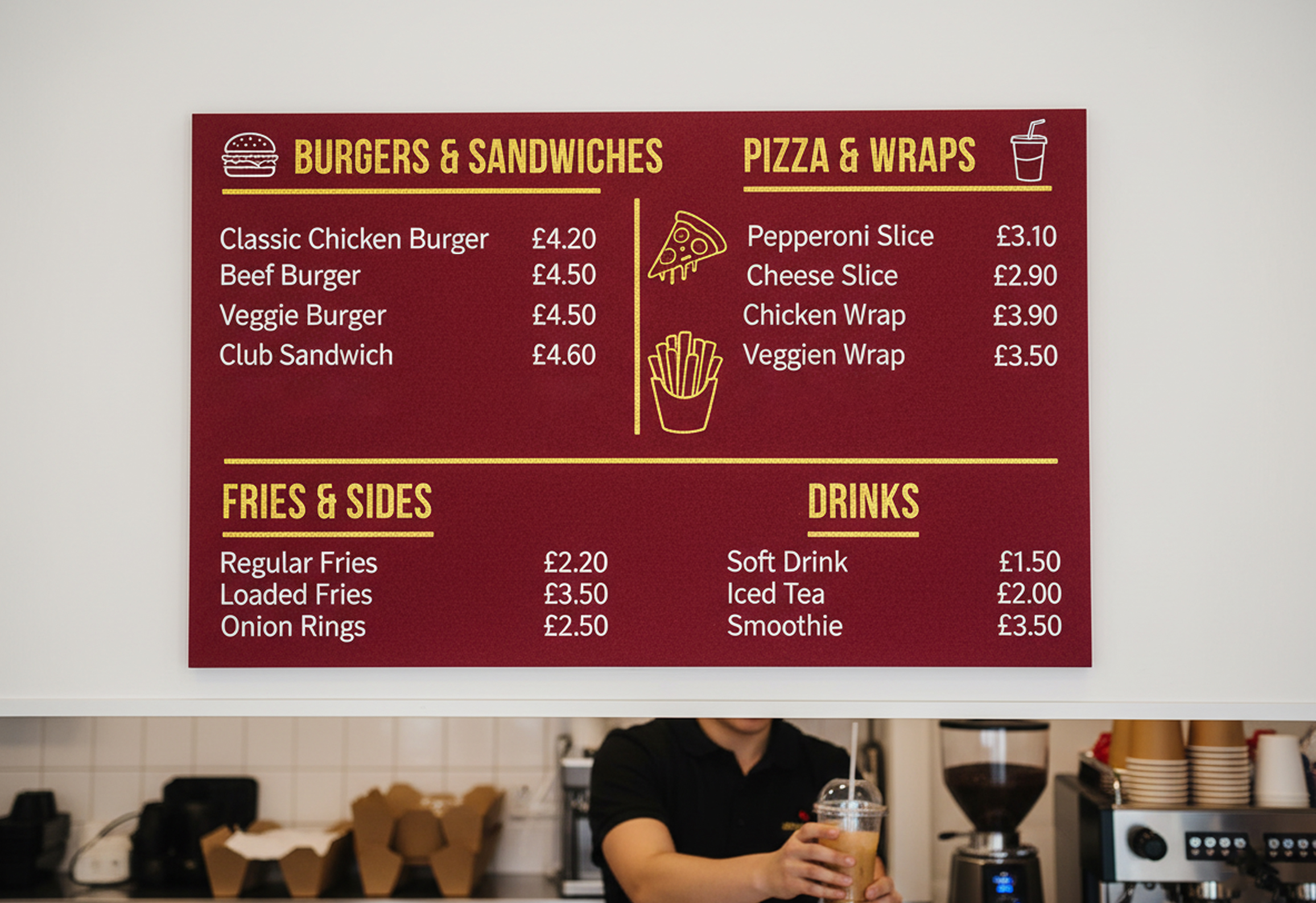 Lamination requirements vary by positioning. Counter proximity demands matt lamination eliminating glare whilst protecting against fingerprints. Photography-heavy menus benefit from gloss intensifying colour saturation. Daily rotation scenarios may not justify lamination if boards serve single-day purposes in protected positions.