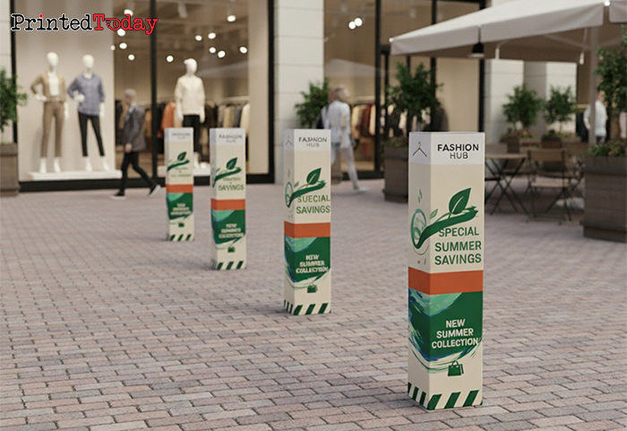 - Retail parks – durable square advertising bollard covers for promotions and offers.