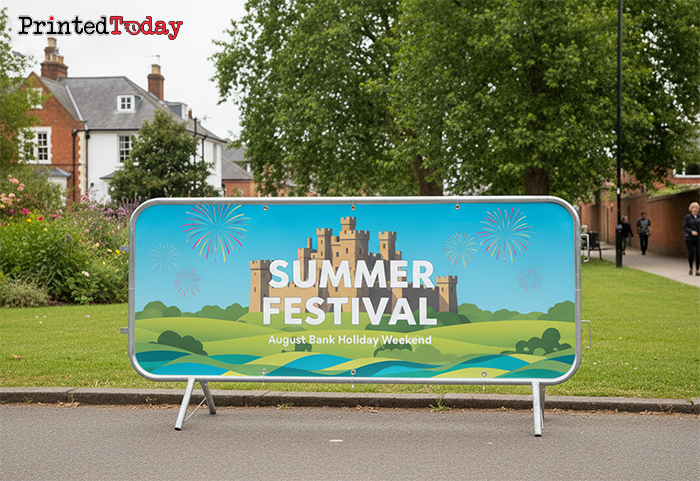 Printed Today offers Vinyl 2.5 m Printed Barrier Covers with free design setup, late cut-offs, and same-day or next-day UK delivery. Our team is available via live chat 17 hours a day to help you order Vinyl 2.5 m Barricade Jackets or Vinyl 2.5 m Event Barrier Covers quickly and easily. With full-colour printing, made-to-measure fit, and fast turnaround, you’ll get premium results at the best value.